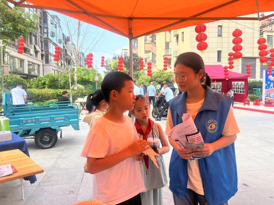 图为志愿者在“龙虾节”现场与小学生进行反诈知识问答