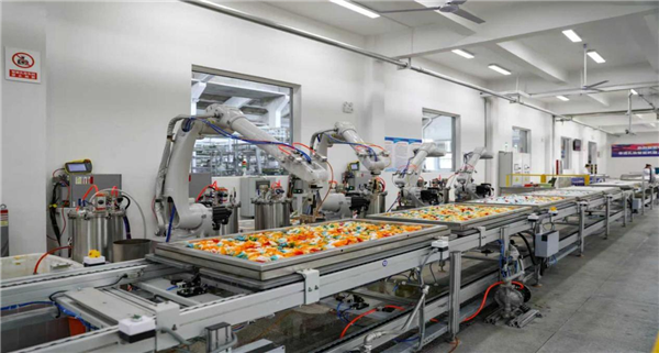 走进江苏华艺服饰有限公司的国内首条非遗扎染智能机器人生产线,人工师傅正在手工扎结,6台AI智能机器人接力注染。“既要守住非遗的‘魂’,也要破解效率与质量瓶颈。”公司扎染事业部负责人景小连介绍,单台机器人等效5名工人,用工量减少50%,换款时间缩至5分钟,月产能最高达10万件,正品率提升至98%。