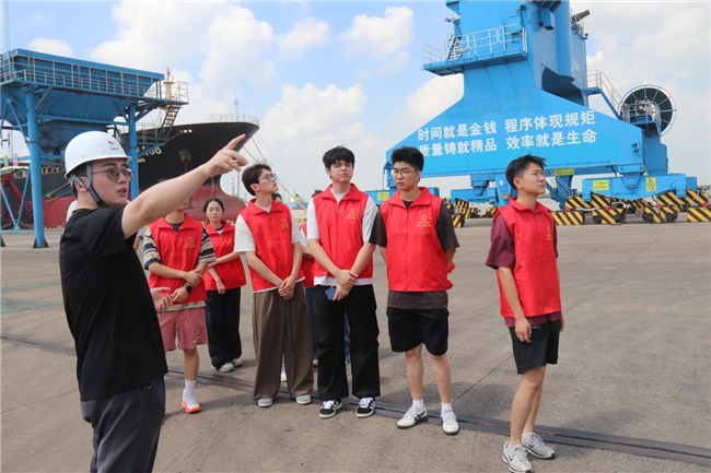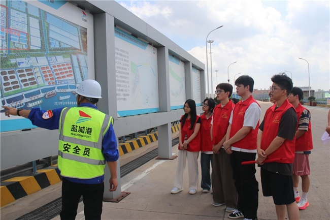 在响水港中心港区,实践团登临观景平台尽览灌河入海口与黄海交汇处的港口全貌。据了解,响水港是长三角北翼重要的海河联运枢纽,依托灌河“黄金水道”与黄海“蓝色资源”的叠加优势,港口规模持续扩张,航线通达多个国家和地区,年货物吞吐量突破5000万吨,是苏北地区规模最大、功能最全的综合性港口,是盐城市“向海图强”的重要支点。实地走访中,实践团亲身感受绿色能源的深度应用:港口岸边,一排排充电桩为靠泊货轮提供清洁电力能源;屋顶和空地上,阳光下的光伏板将太阳能转化为港口运营的绿色动能;自动化作业区内,无人驾驶运输车穿梭往来,电动集卡安静有序地装卸货物,既减少碳排放又提升作业效率。实践团深切感受到响水港从“传统装卸”到“智慧运营”、从“燃油驱动”到“绿色赋能”科技创新赋能的巨大变革和海洋经济与绿色发展深度融合的蓬勃活力。