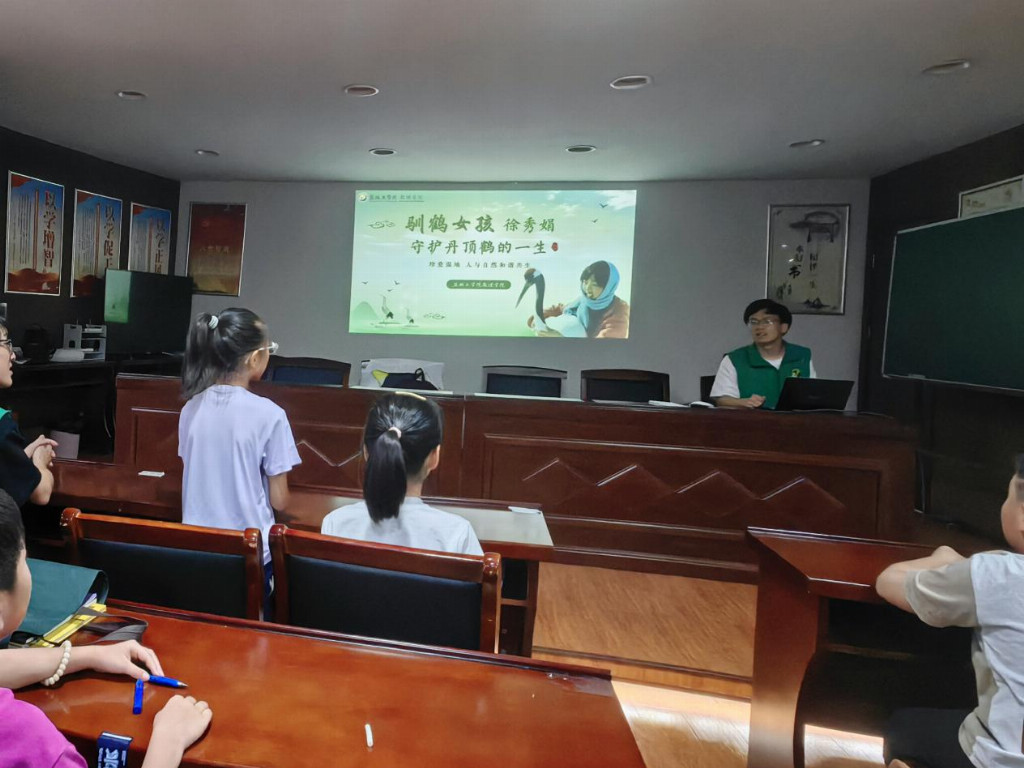 “有没有小朋友知道,丹顶鹤的守护者里,有位永远23岁的姑娘?”心途公益志愿者的提问刚落,孩子们便好奇地睁大眼睛。实践团成员接过话头,以“扎龙的执着”“滩涂的奉献”“沼泽的定格”三个篇章,娓娓道来徐秀娟从东北到盐城,为守护丹顶鹤扎根湿地、最终牺牲的动人历程。