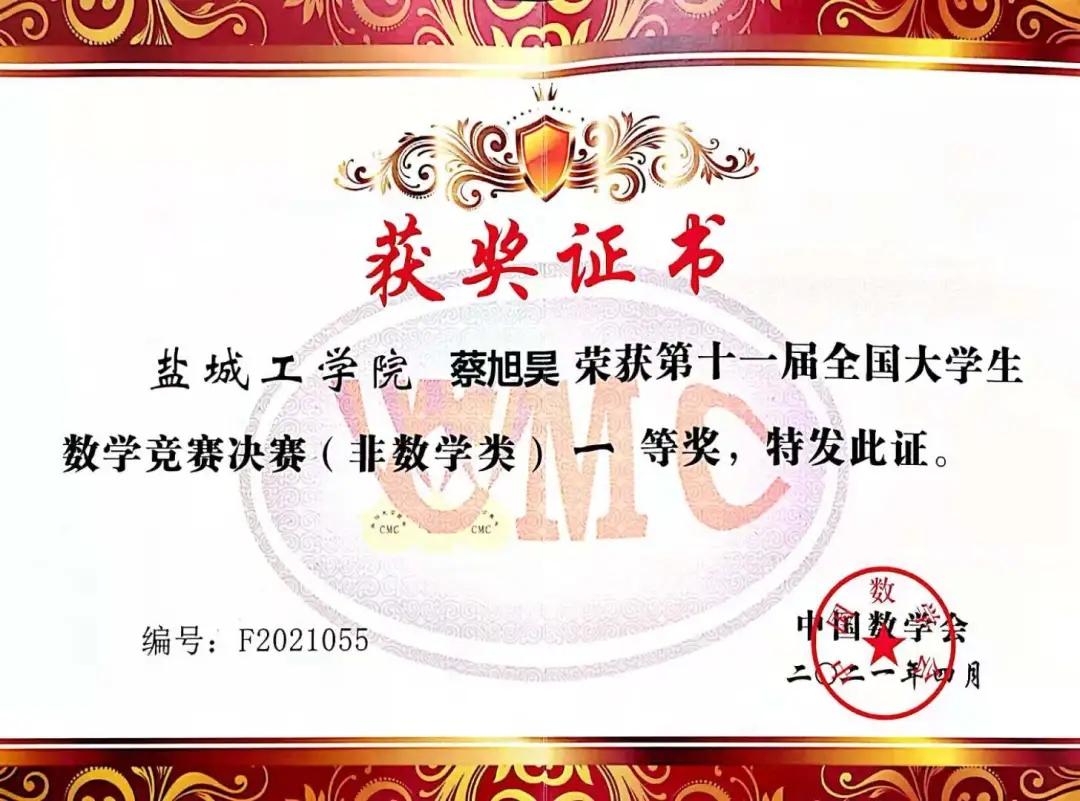 蔡旭昊从大一开始就对数学学习有着浓厚的兴趣,他积极参加各类赛事,连续三年获得江苏省普通高等学校高等数学竞赛一等奖,第十届全国大学生数学竞赛决赛二等奖。