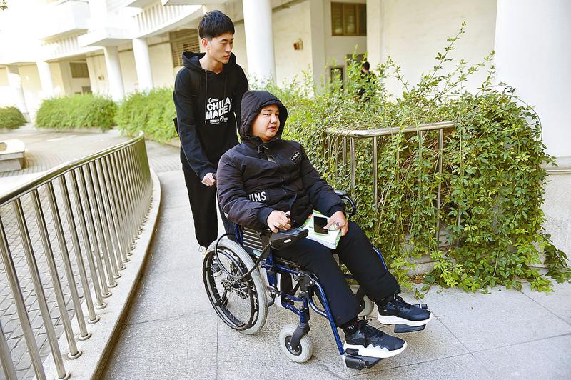 同学推着轮椅经过坡道。