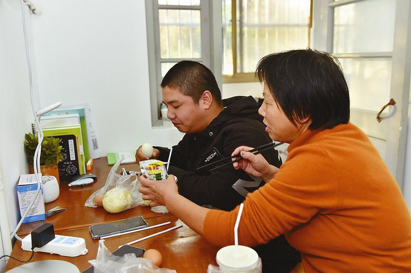妈妈从食堂打来早饭,母子共进早餐。