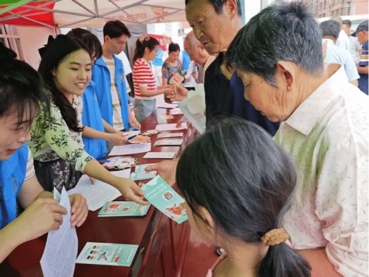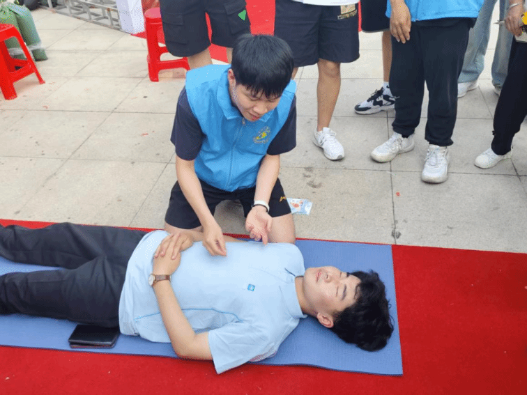 志愿者在盐城天玺小区“龙虾节”现场,设置模拟急救区,用情景短剧再现“有人突然倒地”的应急场景,吸引居民围观参与。