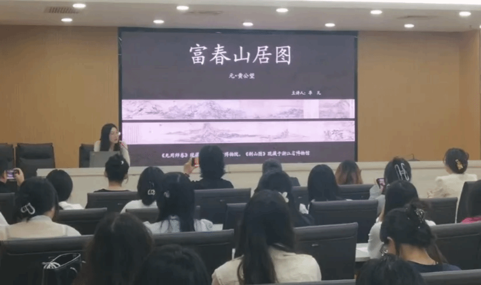 讲座中,季凡以生动的语言和丰富的图像资料,细致讲述了这幅长卷中绵延六米的笔墨意境和精妙构图,以及这件艺术珍品背后与民族命运紧密相连的历史,深入解读这幅被誉为“画中兰亭”的传世名作,带领现场观众领略其独特的艺术魅力。她介绍,《富春山居图》是元代画家黄公望晚年倾力创作的杰作,代表了中国文人山水画的巅峰成就。黄公望以富春江山水为蓝本,不仅绘出自然之景,更融入道家哲学的虚静与旷达,实现了 “物我两忘” 的艺术超越。而这幅画在传世过程中惨遭火焚,断为《剩山图》与《无用师卷》两段,如今分别藏于浙江省博物馆与台北故宫博物院。一画两隔,成为家国历史的沧桑见证。她表示,2011年分离百年的《剩山图》与《无用师卷》在台北故宫博物院重新聚首,这不仅是艺术史上的盛事,更是以文化为纽带促进两岸情感共鸣与文化认同的重要里程碑。一幅画的离合映射着民族的悲欢,它早已超越书画本身,成为中华文明血脉相连、不可分割的象征。季凡深沉而富有感染力的讲述,令现场观众纷纷点赞。