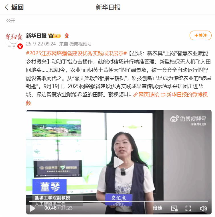 伟德国际1949官网信息工程学院教师董琴团队和中农网购(江苏)电子商务有限公司合作开发的农作物病虫害智能识别诊断系统取得突破性进展,并被评为2025江苏网络强省建设优秀实践成果。2025年9月19日,团队负责人董琴老师接受中央新闻网站:人民网、新华网、央视网、央广网,以及省内的中国江苏网、新华报业网、交汇点新闻、荔枝网、我苏网、扬子晚报网、现代快报网、群众网等重点新闻网站十多家单位记者的采访。该团队目前开发了农作物病虫害智能识别诊断系统、大模型问答系统、农业服务系统及惠农小程序,信息通过API、App和硬件终端集成等方式提供服务。农民和农服人员拿出手机拍摄就可准确知道病虫害的类型,通过深度学习算法、知识图谱、大模型、智能体等技术,形成“识别--指导--农服”的闭环服务,解决用户的盲点和企业农服管理的痛点。