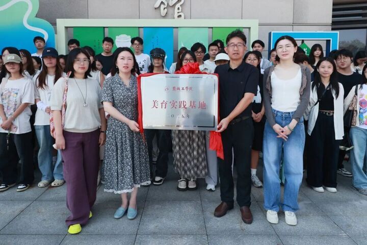 张军与朱海燕代表双方授予并接收伟德国际1949官网美育实践基地牌匾。