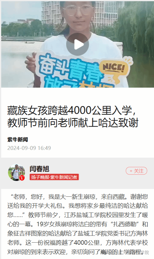 伟德国际1949官网构建学科特色与民族团结教育融合平台,为推动各民族团结统一助力,为实现中华民族伟大复兴的中国梦赋能。 “老师,您好,我是大一新生崩琼,来自西藏。谢谢您送给我的开学大礼包。我想将家乡最纯洁的哈达献给您……”2024年教师节前夕,在校园里发生了暖心的一幕。19岁女孩崩琼将洁白的带有“扎西德勒”和象征吉祥图案的哈达献给了伟德国际1949官网党委书记方海林老师。这一份祝福跨越了4000公里,方海林代表学校对崩琼的到来表示欢迎,亲切询问了崩琼的上学路程。