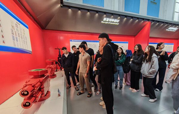 随后,来华留学生们参观了江苏亿德隆石油机械有限公司。标准化的厂房、明亮整洁的车间以及高效运转的“斗山”加工中心、国家级检测中心和全自动喷漆线,展现了企业的现代化制造水平。企业负责人详细介绍了石油钻探设备的制造流程、技术优势及全球市场布局,来华留学生们就产品性能与国际市场开拓等问题与现场人员进行了深入交流。