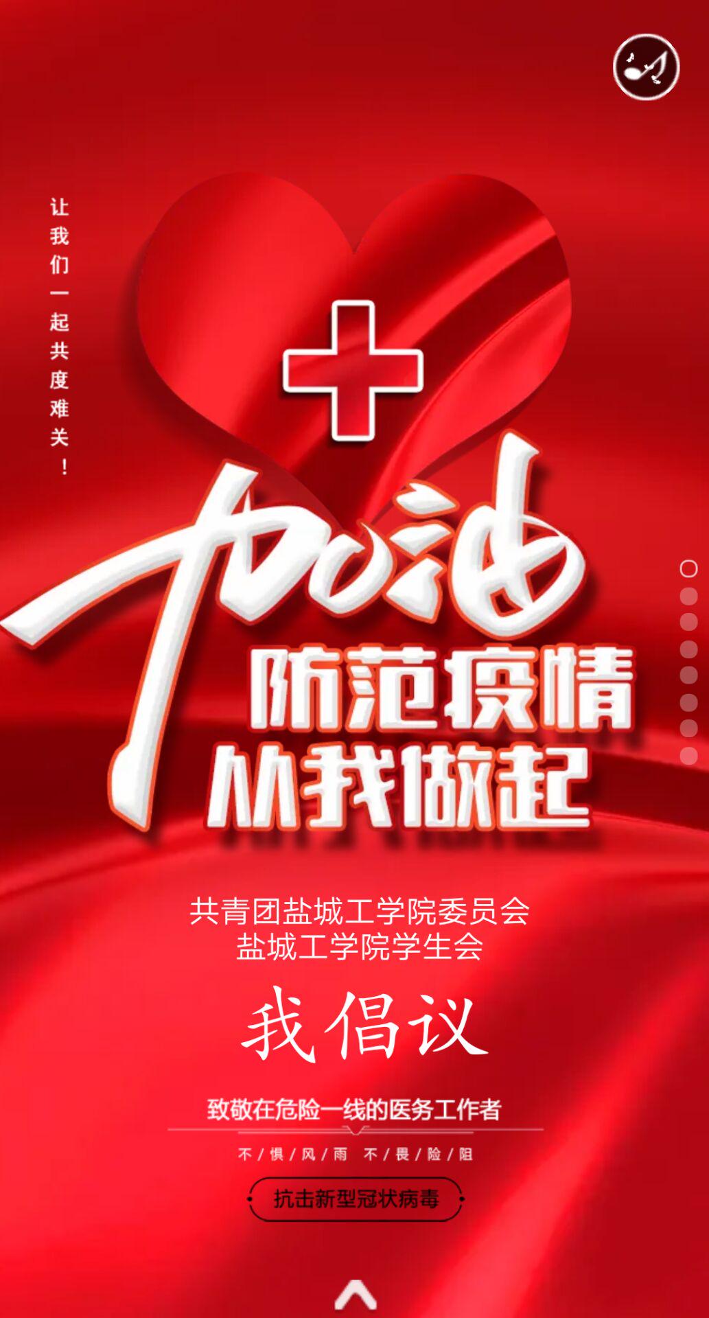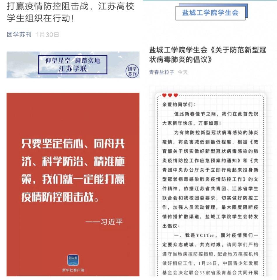 校学生会依托团属新媒体矩阵,守好疫情宣传堡垒。及时发布《关于防范新型冠状病毒肺炎的倡议》,充分发挥校学生会贴近学生的组织优势,引领广大同学听指挥、勇担当、见行动,被江苏省学生联合会微信公众号团学苏刊集中报道点赞。发起“防范疫情,从我做起,我是第XXX位承诺者”云接力,截止2月2日,共有10600位“盐粒子”在线参与接力承诺。