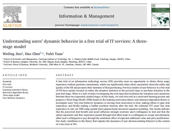 该论文首次将用户免费试用看作完整的、相互作用的学习过程,并基于学习激励理论和参考依据学习理论提出三阶段模型(TSM),基于TSM的实证研究表明:用户感知的试用好处与社会影响是驱动用户试用意愿的主要因素、用户在试用过程中获取的效用体验和沉浸体验是驱动用户接受意愿的主要因素、用户预期的额外价值和理想价格是决定用户购买的主要因素。该研究结果的理论贡献在于能够更为科学合理地解释信息技术服务免费试用背景下的用户动态决策行为。