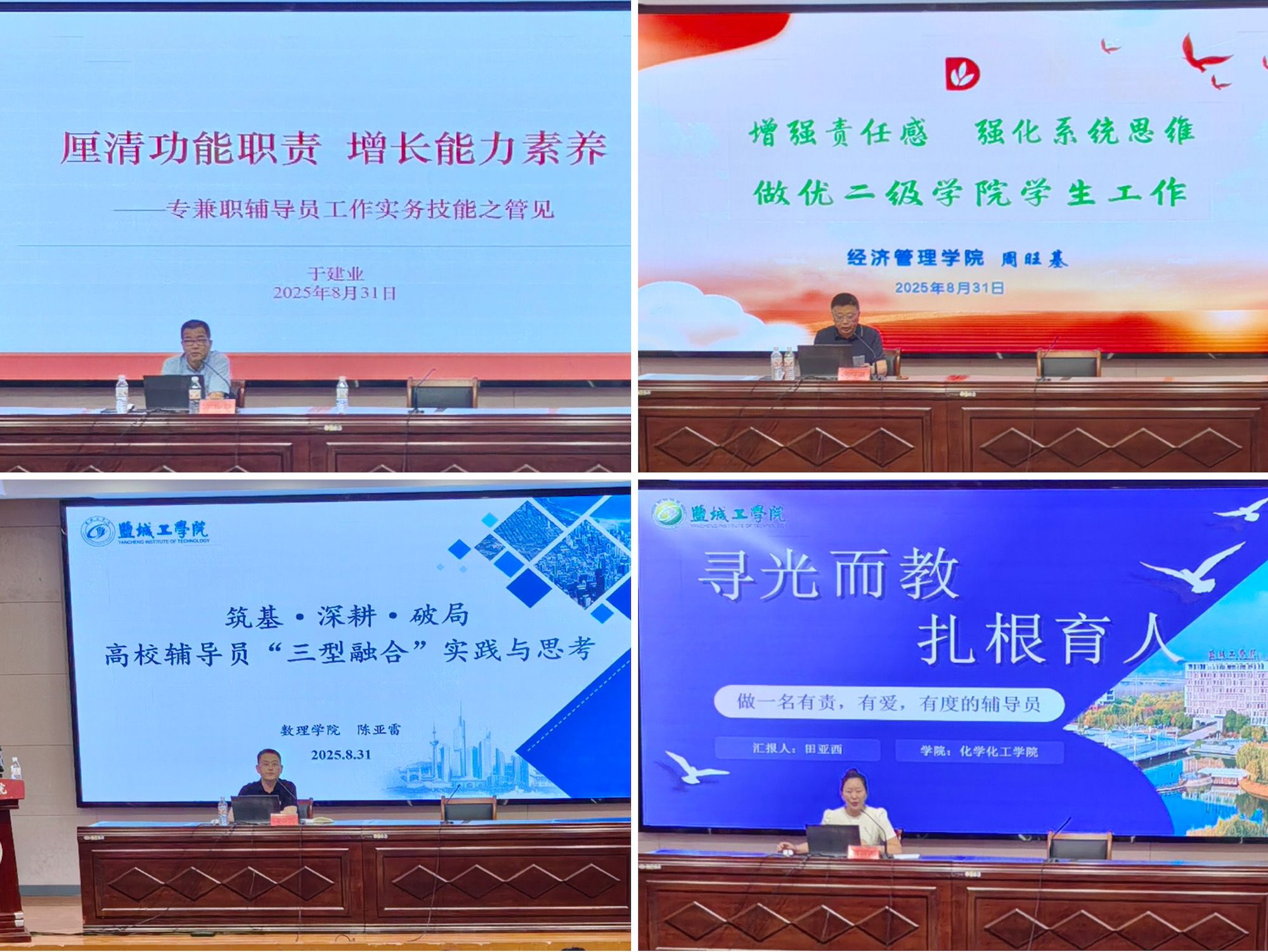 电气学院党委书记于建业以《厘清功能职责,增强能力素养》为题,结合多年深耕学生工作一线的丰富实践经验,系统梳理了辅导员工作的核心职能与价值定位,细致分享了学生工作法则,为全体辅导员增强育人实效提供了深刻启发和路径指引。经管学院党委副书记周旺基聚焦学生工作的典型特点,以《增强责任感,强化系统思维,做优二级学院学生工作》为题,强调以全局观念树牢责任意识、以系统思维整合育人资源。数理学院分团委副书记陈亚雷从一线工作的实际感受出发,作题为《筑基·深耕·破局,高校辅导员“三型融合”实践与思考》的报告,就思想引领、学生管理和职业发展等进行了交流。化工学院专职辅导员田亚西则以《寻光而教,扎根育人,做一名有责、有爱、有度的辅导员》为题,分享了走近学生、了解学生的艺术、策略和实践思考。