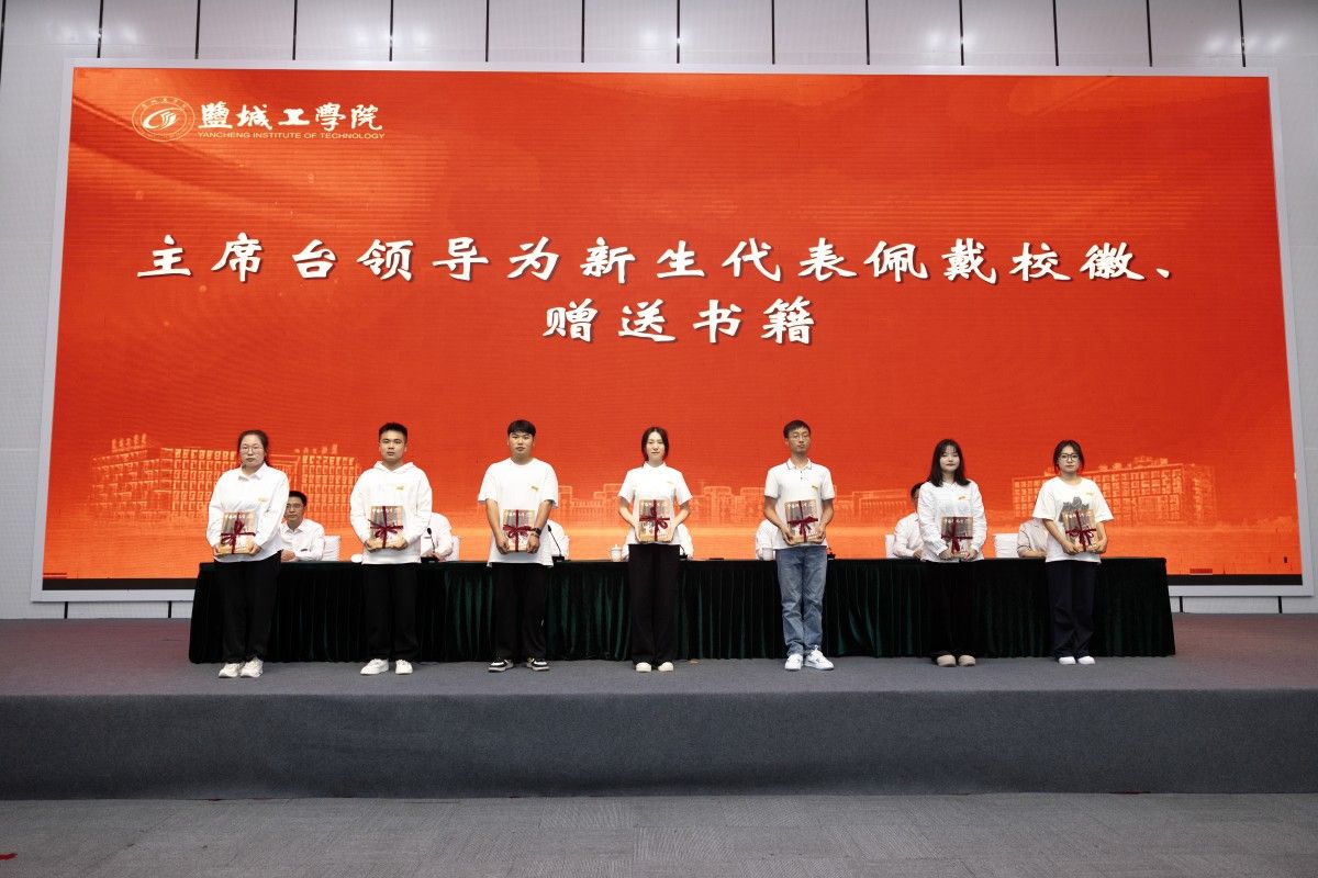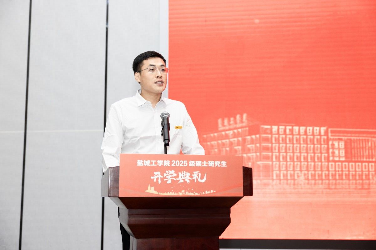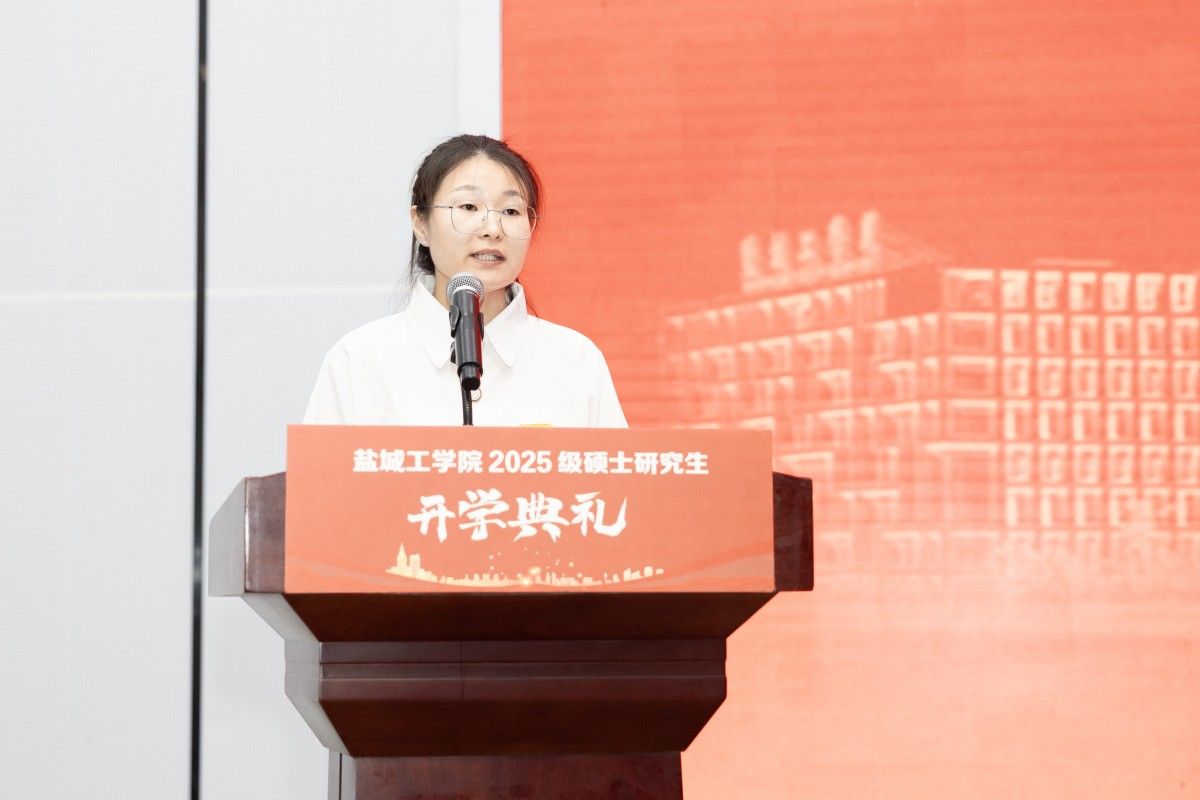 王资生宣读研究生学科竞赛先进个人表彰决定。主席台领导为新生代表佩戴校徽、赠送书籍,并为获奖研究生颁发荣誉证书。新生代表、化学化工学院Y材化251班张文同学发言,表达了对研究生生活的憧憬与决心;2024年国家奖学金获得者、海洋与生物工程学院Y海生231班冯婉君同学作为在校研究生代表分享科研心得;研究生导师代表、机械优集学院副院长(主持工作)宦海祥寄语新生树立远大志向,坚守学术诚信;企业导师代表、江苏兴泰集团有限公司总经理朱迎春寄语同学们立足实践、面向产业,成为推动技术革新的中坚力量。