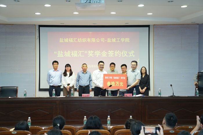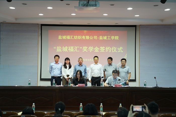 活动中,王春霞与李刚共同签署《盐城福汇奖学金捐赠协议》,福汇纺织有限公司向学校捐赠30万元奖学金。盐城福汇每年出资10万元设专项奖,面向纺织服装、机械工程等多个学院三、四年级本科生及研究生评选。