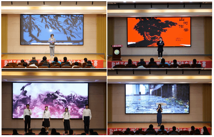 本次比赛吸引了全校各二级学院70支队伍、100余名选手参与。经过初赛、复赛的激烈角逐,14支队伍脱颖而出,会师决赛。“身长翅膀吧脚生云,再回延安看母亲!”材料工程学院陈沪凤等同学以浑厚深情的朗诵,将那份对延安的赤子之情化为穿越时空的呼唤,让红色圣地的温暖久久回荡。“但是太阳,他每时每刻都是夕阳也都是旭日。”化工学院刘亦轩同学以沉静哲思的语调,引领观众在落日与朝阳的交替中,体悟生命永恒的光明。“我希望飘过一个丁香一样地结着愁怨的姑娘。”海生学院滕文聪同学嗓音轻柔婉转,仿佛铺展开江南雨巷的朦胧画卷,让诗意的惆怅浸润每个人的心怀。“我们相信,中国一定有个可赞美的光明前程。”人文学院吴霜同学用清澈而坚定的声音,勾勒出民族复兴的壮阔图景,传递出新时代青年对祖国未来的炽热信心。