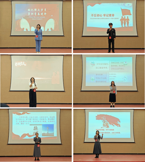 本次大赛自启动以来,吸引了全校二级学院共60名同学踊跃报名。经过初赛激烈比拼,18名选手脱颖而出晋级决赛。B工商251班殷文欣以《山河无恙承先烈,和平致远启新程》为主题,通过今昔对比深刻阐释和平的珍贵,语言铿锵,富有历史厚重感;B旅游241班阿迪莱·阿卜杜外力别开生面地讲述《戈壁丹心照山河》,呈现新疆各族人民支援抗战的感人故事,视角独特,情深意切;Z化工231班周钰棋以《不忘初心、牢记使命》为题,结合退伍士兵经历与“夜袭阳明堡”战役故事,展现军人血性担当,以朴实语言震撼人心;B视传251班王雨涵在《烽火照初心,青春承使命》中聚焦杨靖宇、赵一曼等英雄事迹,生动诠释抗战精神,情感饱满,极具感染力。