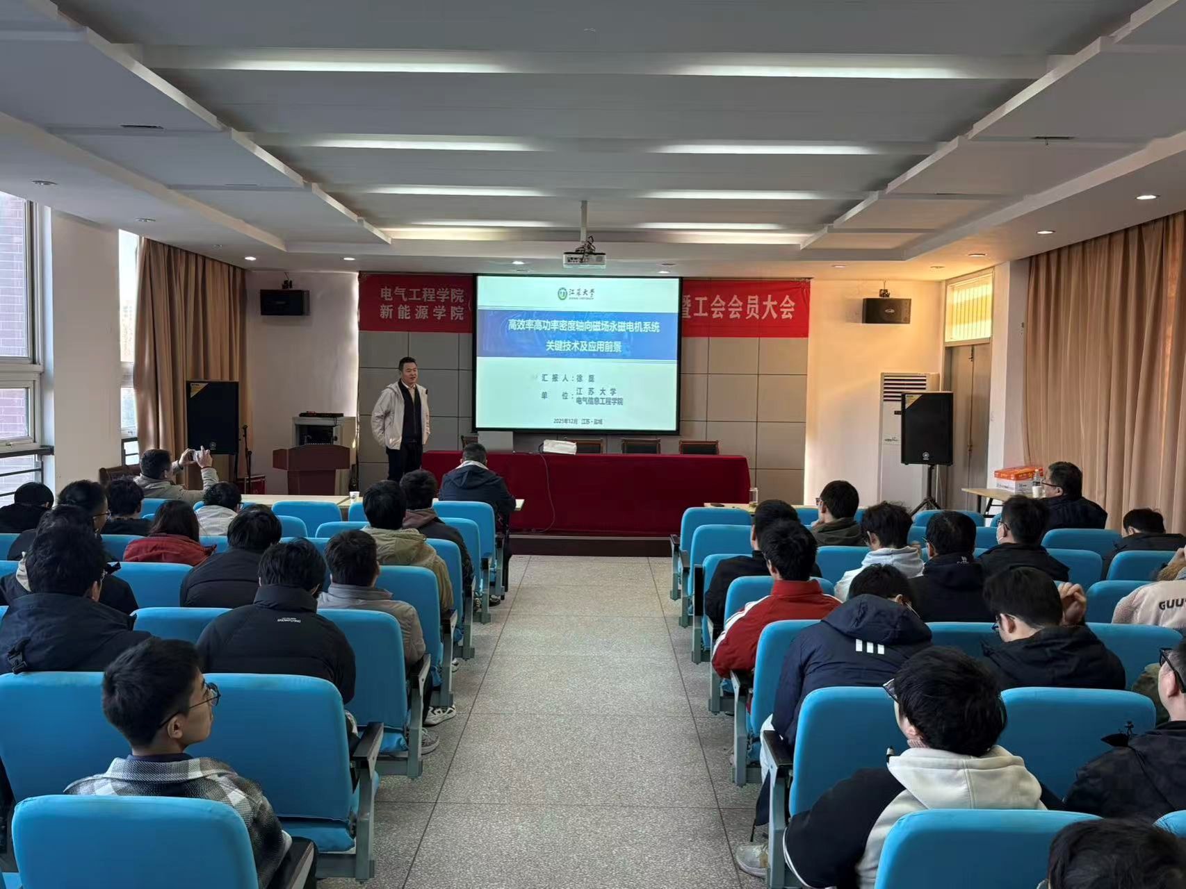 第二场报告由徐磊校友主讲,报告题目为《高效率高功率密度轴向磁场永磁电机系统关键技术及应用前景》。徐磊校友现为江苏大学副教授、硕士生导师、电气系副系主任,长期从事永磁电机设计与控制的前沿研究。他系统阐述了轴向磁场永磁电机在新能源汽车、航空航天、机器人等高端装备领域的应用潜力、核心技术挑战与未来发展趋势,展示了其团队在电机创新设计、高性能控制策略及知识产权转化等方面取得的一系列重要突破。他立足国际学术前沿,紧密结合工程实际,为听众描绘了电气驱动技术未来发展的清晰图景。徐磊校友结合自己从盐工学子到青年博士的亲身经历,勉励同学们树立终身学习的理念,通过持续学习不断夯实科技素养,以应对未来技术发展的挑战。