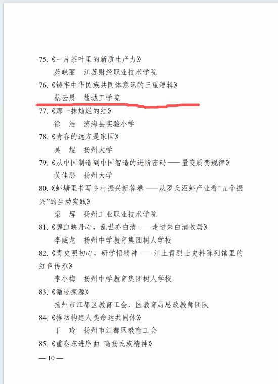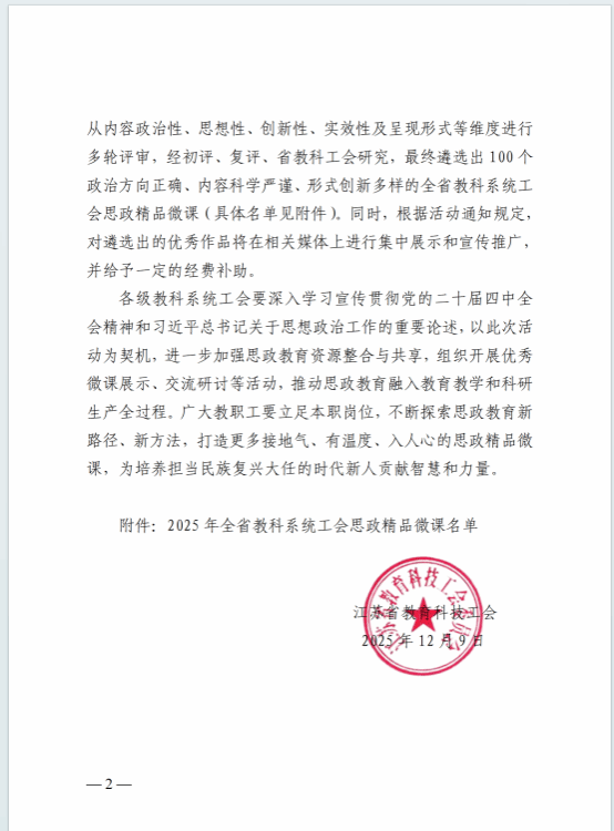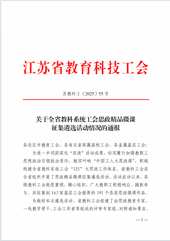 近日,江苏省教育科技工会公布2025年全省教科系统工会思政精品微课征集遴选结果(苏教科2025[55]号),伟德马克思主义学院蔡云晨老师的微课作品《铸牢中华民族共同体意识的三重逻辑》成功入选。