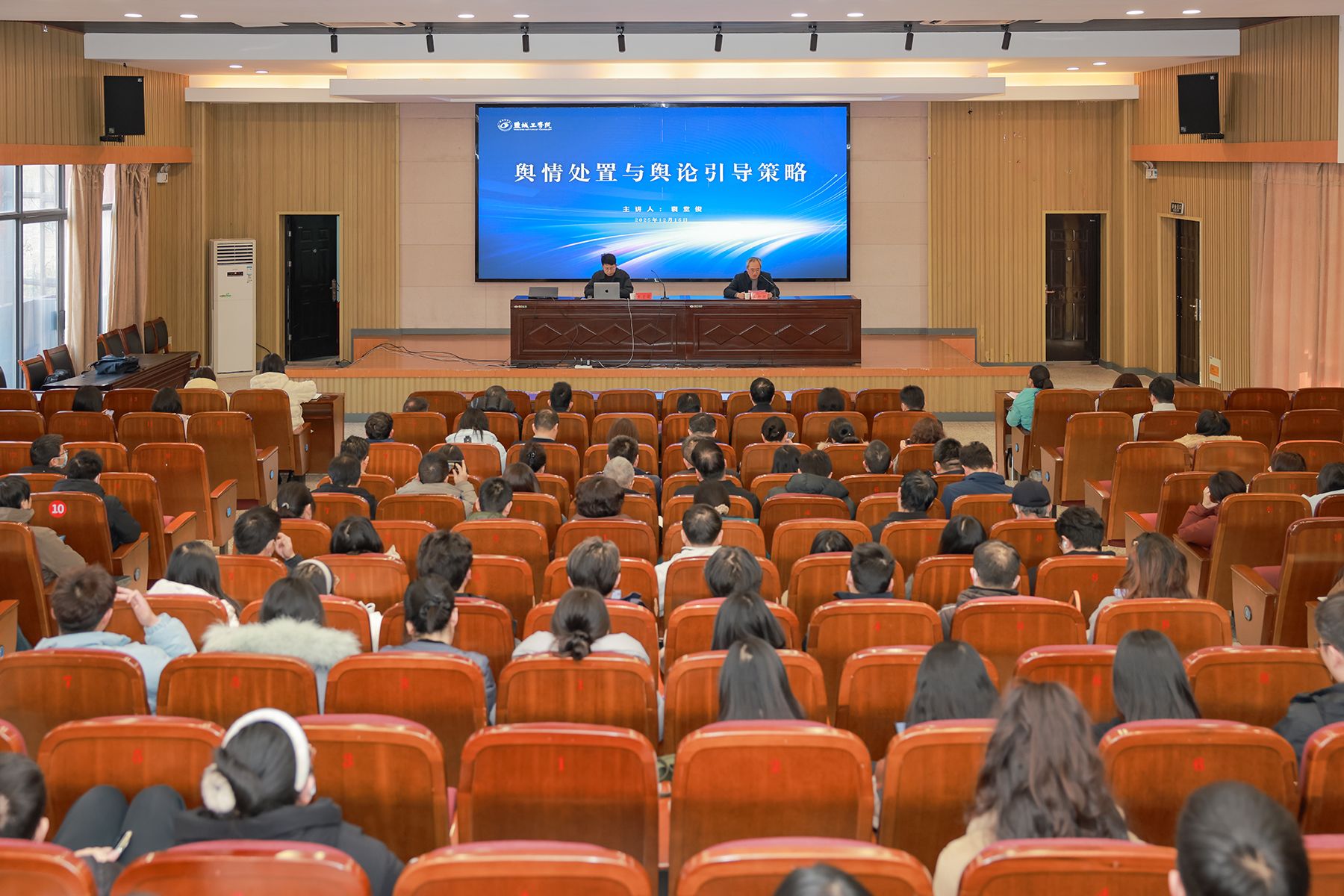 12月16日下午,学校在希望大道校区机械馆报告厅召开网络舆情应对处置专题培训会,邀请人民网高级舆情分析师、金鸽舆情观察室主任袁堂俊作专题报告。党委常委、宣传部部长奚新国主持,意识形态重点领域相关单位负责人、各二级学院党组织负责人、全体专兼职辅导员等200余人参会。