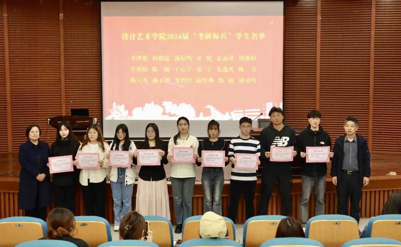 叶禎菲宣读《设计艺术学院关于表彰2024年考研优秀学生的决定》,并介绍学校出国留学硕士项目相关政策。与会领导和老师为考取研究生学生颁发“考研标兵”荣誉证书。考取研究生毕业生代表D环艺191班邹楚江、B视传201班郭惊鸣、B服装202班燕子尧依次分享各自的备考经验和收获感悟。21级考研学生代表B产品212班刘政楠作表态发言。