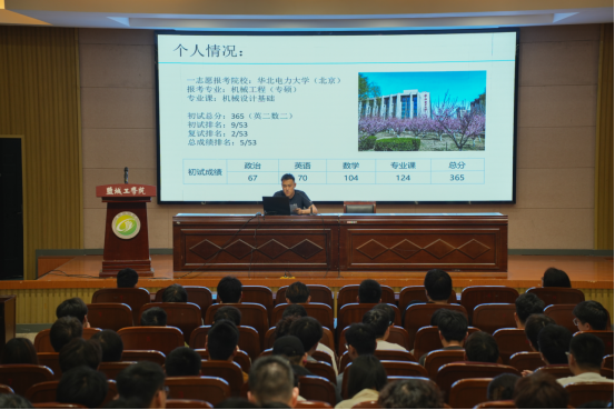 为了充分发挥朋辈力量,帮助考研学生提升备考技巧,增强考研信心,机械优集学院从2024届成功考取研究生的同学中遴选出7名学生,成立了2024届考研经验宣讲团,于5月19日晚和5月20日晚,分两场在南校区机械馆报告厅开展考研心得分享,学院党委副书记马晓英、学工办副主任程云庆、大三年级辅导员和金李烨等7名考研上岸的学生代表出席,2021级意向考研的400余名同学参会。程云庆主持。
