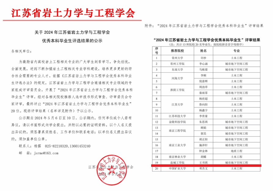 日前,江苏省岩土力学与工程学会公布了2024年江苏省岩土力学与工程学会优秀本科毕业生名单,伟德土木工程学院城市地下空间工程专业B城市201班王书琪同学获此殊荣。