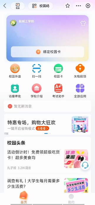 步骤二:点击进入上图“完美校园”小程序,按提示进行校园卡绑定(如进入时显示已绑定,出于安全验证需要,请解绑后重新绑定)