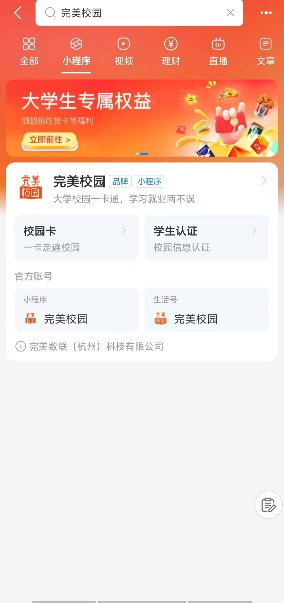 步骤一:支付宝搜索“完美校园”,选择小程序