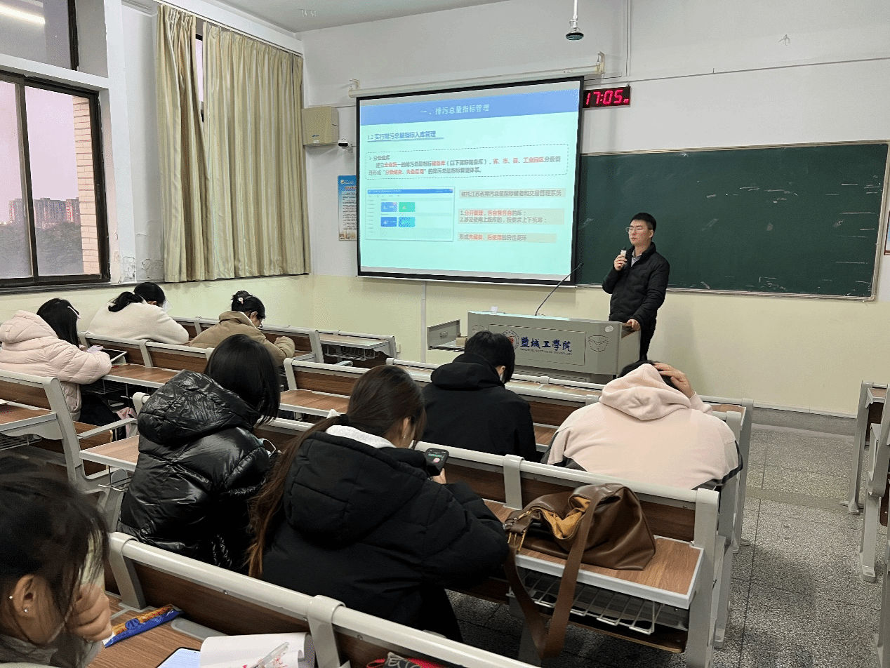 潘顺龙以“化工废水处理探索与实践”为题,系统介绍了当前江苏省工业园区废水治理的政策导向与技术进展,并结合自身丰富的实践经验,生动阐述了化工废水处理中的关键技术与工程实践。孙云龙则聚焦“排污总量与排污权交易管理”,深入解读了排污总量控制制度的设计逻辑、配额分配机制与市场运行模式,为学生理解环境管理政策提供了清晰的理论与实践框架。两场报告紧扣行业发展与政策前沿,内容翔实、案例生动,有效拓宽了学生的专业视野,强化了对环境工程实际问题系统性把握的能力。